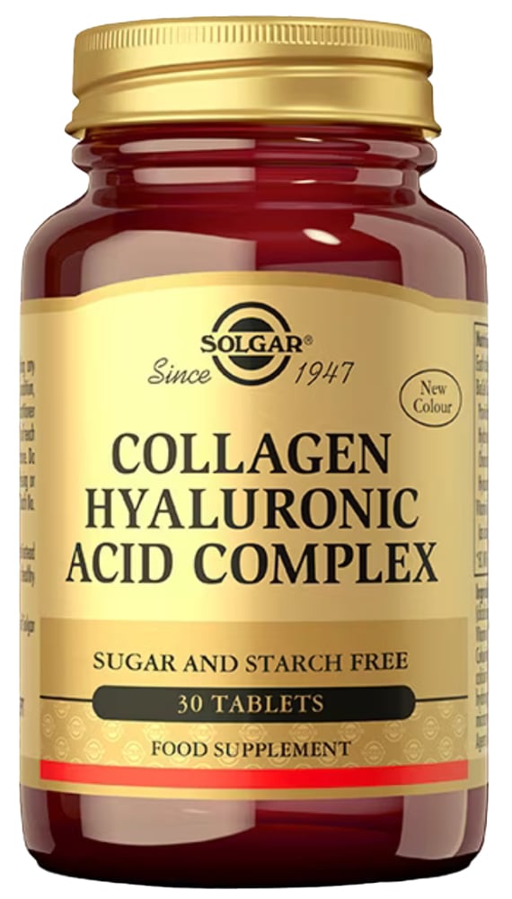 Collagen Hyaluronic Complex, de Solgar. Complemento alimenticio formulado con Ácido Hialurónico. El Ácido Hialurónico es un componente de la piel y articulaciones que en el organismo disminuye de forma natural con la edad. Aumenta la hidratación y ejerce de lubricante entre la matriz de colágeno y la capa más externa de la piel, por lo que complementar la dieta con Ácido Hialurónico puede asegurar niveles adecuados de esta molécula en la piel, favoreciendo sus funciones y dándole un aspecto más saludable.