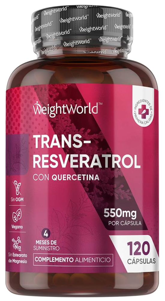 Trans Resveratrol con Quercetina, de Weightworld. Este compuesto es conocido especialmente por sus cualidades antioxidantes, dado que ayuda a proteger a las células de los radicales libres responsables del envejecimiento prematuro. No son las únicas propiedades del resveratrol, pues también ayuda a mejorar la salud cardiovascular, apoya el sistema inmune y favorece la pérdida de peso. Su precio: 25,95€/120 cápsulas.