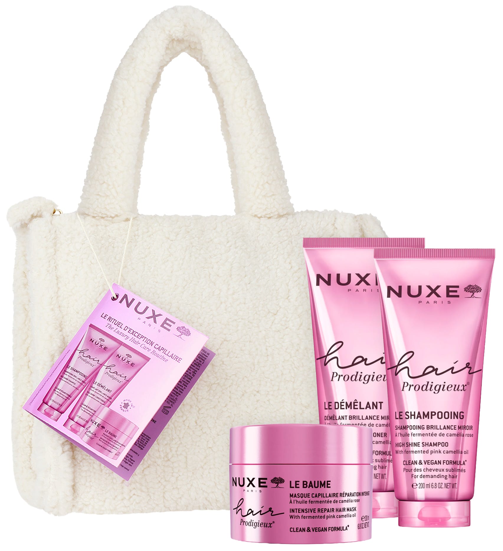 Este bolso cofre contene tres esenciales de la gama Maire Prodigieux para un cabello brillante y sedoso, impregnado una delicada fragancia floral. El champú, el acondicionador y la mascarilla ofrecen una experiencia ssensorial que revela toda la eficacia del cuidado capilar de la marca.